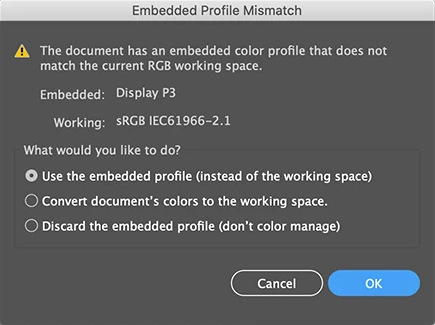 Pokud upravuješ fotky ve Photoshopu, je velká šance, že jsi se s tímhle oknem už setkal(a). Vyskočí tabulka, která upozorňuje na neshodu barevného prostoru, a ty najednou nevíš, co