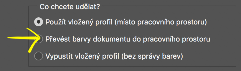 Hláška se objeví ve chvíli, kdy otevřeš fotku s jiným barevným prostorem, než má Photoshop nastavený jako výchozí.